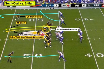 With the Bills running the Semi-Curl (seam-curl-flat) versus 2-Man (two-deep, man-under), Shazier is matched up against tight end Scott Chandler on the inside vertical seam.