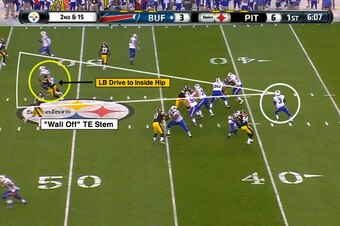 However, I want to focus on the open-side blocking technique with the left guard/left tackle versus the linebacker and Clowney.
