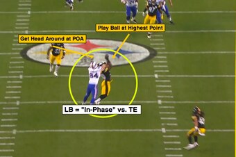In 2-Man, the Steelers linebacker has help over the top, with both the free safety and strong safety driving top-down to overlap any throw to the middle of the field. This allows Shazier to play with a “trail” technique (inside leverage, drive to hip) versus the vertical stem.