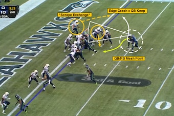 On Friday night in Seattle, Russell Wilson scored on a one-yard touchdown run off the packaged read (read-option) versus the Chargers’ zero-pressure scheme when he beat linebacker Manti Te’o to the edge of the formation.