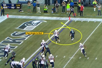 With the guard now beat, Clowney can turn the corner, flatten his angle and track the running back on the inside give from the gun.