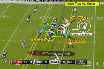 Here's an inside trap out of the gun with the Falcons’ right tackle pulling to “wham” the open-side defensive tackle in order to create a quick, inside running lane versus the Texans' sub-package front.