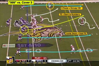 On Saturday night, quarterback Matt Cassel targeted Rudolph on the “999” concept (four verticals from a 3x1 alignment) to beat the Cardinals' three-deep coverage for a 51-yard touchdown.