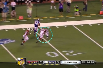 After Rudolph beats the cornerback in the open field, McKinnon peels back to pick up the free safety. This creates a clear run for the Vikings tight end to walk into the end zone on a route we will see every Sunday during the regular season.