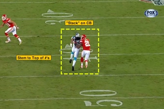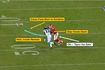 With Benjamin in a “plus-split” (three yards outside of the numbers), Smith uses an inside-eye alignment and plays from a press-position (use sideline as help).