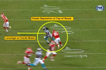 Here, Benjamin sinks at the top of the route and breaks inside (with Smith trailing) to finish this play on the throw from quarterback Cam Newton.