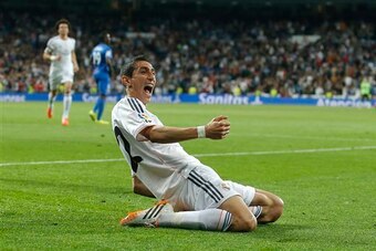 3 of 10Di Maria put Madrid 3-0 up at the Casa Blanca during their 2012 Liga tie with Racing Santander with a wonderful left-foot curling drive. The Racing keeper got his hands on it but couldn't contain it.