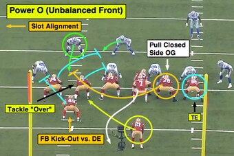 With the 49ers, they will mix their personnel/alignment to create angles and matchups in the run game to win at the point of attack. That will show up with the Power O, Wham and Lead.