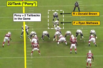 On Monday night in the Chargers-Cardinals matchup, Ryan Mathews scored on the old-school fullback “belly” dive out of a “Pony” alignment with Tank/22 personnel on the field (1WR-2TE-2RB).