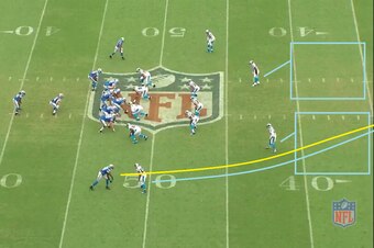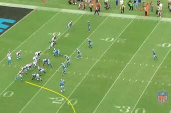 Against Carolina, Slay's loose coverage was exposed a handful of times. On this play, he was lined up as the left cornerback at the bottom of the screen. The Panthers came out in a 3 x 1 look with the single receiver, tight end Greg Olsen, split off to the right.