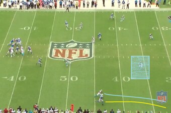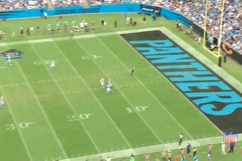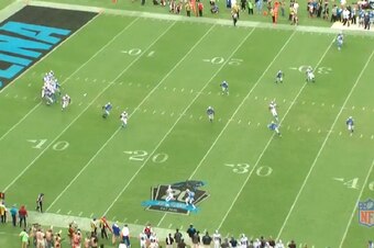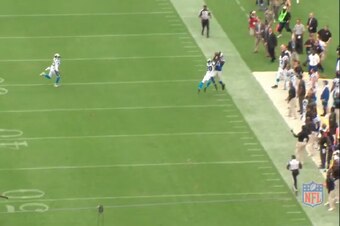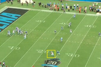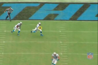 With the ball in the air, both defensive backs were able to make a play. The bracketing tactic helps negate Johnson's height and leaping ability. If nothing else, the two Panthers had two bodies in position to disrupt the process of the catch.