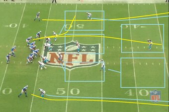 Here's another Cover 2 play against a vertical Johnson. This time, the execution on defense is much, much better. Off the jump, Calvin Johnson gets inside leverage on the corner. To Carolina, this is fine, since the safety should take the inside of Johnson, putting him between two defensive backs—a technique known as bracketing.