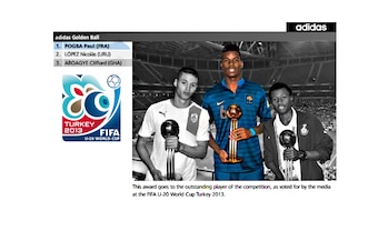 July 13, 2013, per FIFA's official website: Pivotal member of France's FIFA U-20 World Cup winning squad. Received the Golden Ball for "outstanding player of the competition."