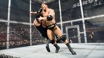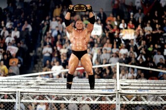 Action spilled outside the squared circle, outside the cell and to the arena floor. There, they battle back and forth, Foley scoring with a piledriver through the announce table before heading to the top of the cell. There, a 2x4 was set ablaze, Triple H was blasted in his bloodied face and Foley appeared well on his way to capturing the heavyweight title. Unfortunately, a backdrop through the cell's ceiling spelled the end of Foley's night—and career.