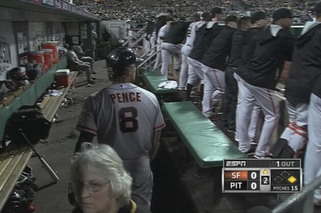 During the game, an elderly woman wearing a Pirates jersey somehow ended up in the Giants dugout. A security guard then spotted her and tried his best to assist.