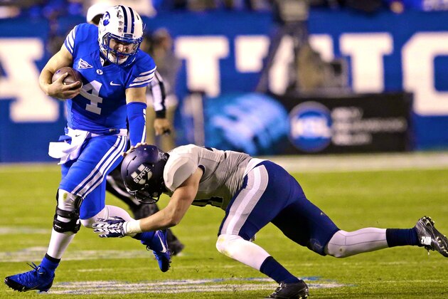 BYU quarterback Taysom Hill suffered a fractured leg injury and left the game against Utah State in the second quarter.