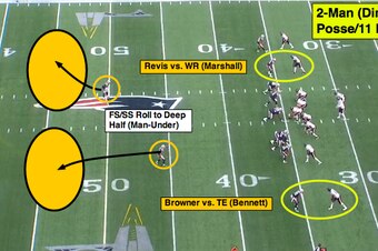 In the Week 8 win over the Bears, the Patriots played 2-Man in their dime personnel (six defensive backs) with Revis matched up versus Brandon Marshall (slot) and Browner going outside the numbers to press tight end Martellus Bennett (take away the smash route).
