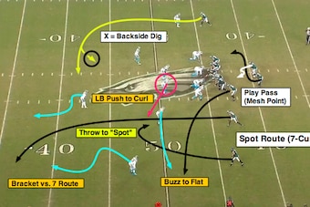 Here's a quick example with the Panthers playing a quarters/matchup technique versus the spot route, a 7 (corner)-curl-flat combo that has been around for decades. All the Eagles do here is widen the splits to dress it up with wide receiver Jeremy Maclin running the backside dig.
