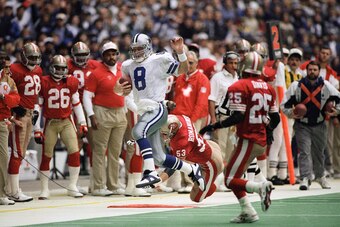 11 of 12With these two teams combining to win five Super Bowl titles in the '90s—many of which came after beating one another in the NFC title game—it's apparent that there wasn't a more intense NFL rivalry than the Dallas Cowboys and San Francisco 49ers during the decade.