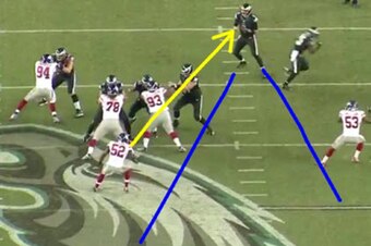 Here’s an example from this year’s game against the Eagles when quarterback Nick Foles attempts to hit receiver Jeremy Maclin over the middle with Beason in coverage. Once the ball is snapped, Foles faked a handoff to the running back.
