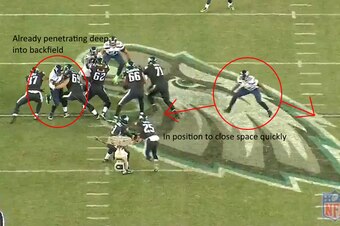 That was the patient part on this play. The aggression came from defensive end Michael Bennett on the other side. Before McCoy even took the handoff, Bennett had already launched himself nearly through the line, blowing up the gap between the tight end and guard.
