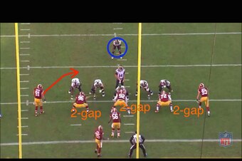 That's just what happened here. Cofield locked up the right tackle, while nose tackle Chris Baker commanded a double-team inside. This meant at least one outside 'backer would have a free rush lane to the quarterback. In this case it was Kerrigan: