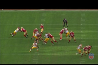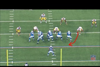 This was a very well-designed pressure by Haslett. But the concept hinged on Kerrigan's ability to use his athletic gifts to attack different gaps. That's the advantage a versatile rush end offers a play-caller.