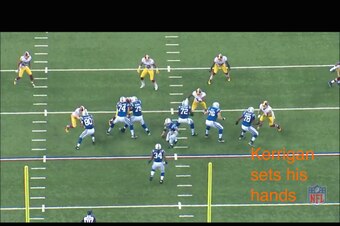 But Mason didn't make strong enough contact, partly because Kerrigan was agile enough to avoid the brunt of the low block. He ran through Mason's shoestring attempt and engulfed quarterback Shaun Hill: