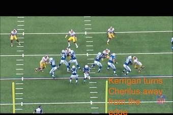 First, Kerrigan clamped onto Cherilus, almost at wrist level. He was able to redirect the tackle's long arms and begin turning him away from the outside rush lane: