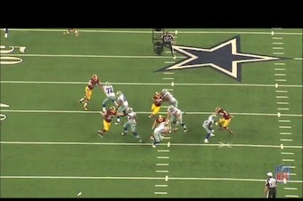 Rookie guard Zack Martin helped double-team Kearse's outside slant, while running back Lance Dunbar was forced to corral Meriweather coming off the edge: