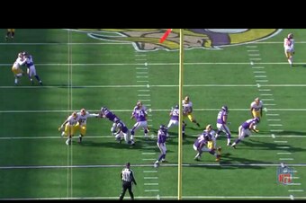 Kerrigan showed another string to his bow on this rush. Instead of quick and clever hands technique, he used brute force strength to overpower Minnesota right tackle Phil Loadholt.