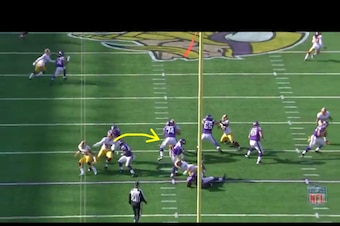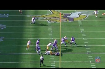 With Loadholt having been made to take a seat, Kerrigan had a free lane to first-year quarterback Teddy Bridgewater. The Vikings rookie signal-caller had to step up to avoid the pressure. But he was stepping right into Hatcher's path.