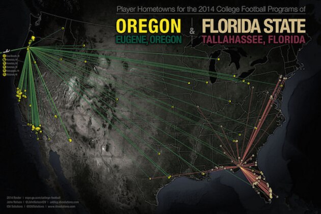 To give fans an idea of where each team has gotten its recruits from, John Nelson of IDV Solutions has put together some maps that show the hometowns of each team's players.