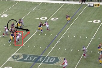 On the play, Wynn (red box) sheds his block, anticipating that Hill (black circle) is about to step up into the pocket.