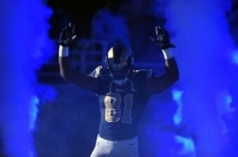 Event: St. Louis Rams players put their hands up while taking the field at home, a gesture of support for Michael Brown, a teenager who was gunned down by police officer Darren Wilson in August.