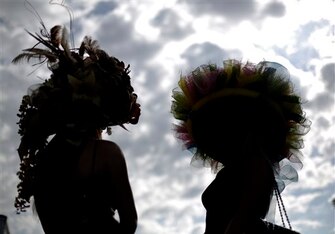 Event: Two women in attendance at the Kentucky Derby are pictured in silhouette.