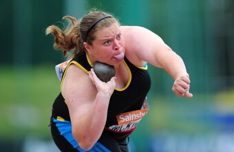 Event: A woman is captured at just the right time (or wrong time depending on your perspective) competing in shot put at Sainsbury’s British Championships in Birmingham.