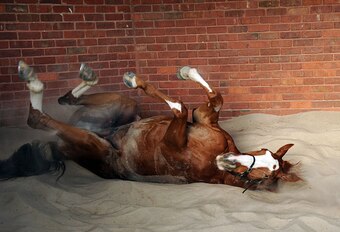 Event: Looks Like The Cat rolls in the sand at Flemington Racecourse in Melboure, Austrailia, following a training session.