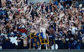 Event: Students from Yale University strip down to their underwear during the second half of the Bulldogs' football game against Harvard.