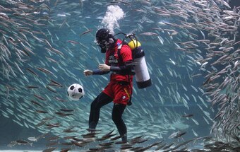 Event: A diver at the COEX Aquarium in Seoul, South Korea, kicks a soccer ball in a tank filled with sharks and sardines to show support for the team ahead of the World Cup.