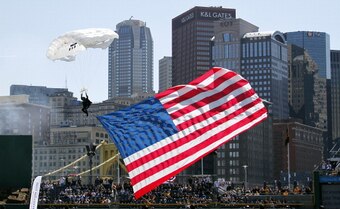 Event: A skydiver descends upon PNC Park in Pittsburgh prior to the Pirates' Opening Day game against the Chicago Cubs.