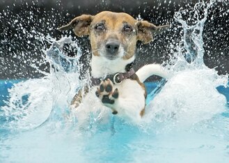Event: A Jack Russell Terrier swims furiously during a dog diving competition in Erfurt, Germany.
