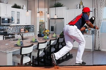 Event: During a spring training game in Arizona, Cleveland Indians outfielder Carlos Moncrief catches a ball up against an advertisement for a local home builder on the right-field wall.
