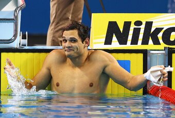 Event: Florent Manaudou of France playfully shrugs his shoulders after breaking the world record in the 50-meter backstroke final at the FINA World Championship.