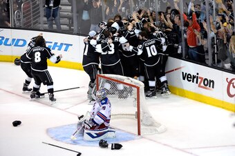Event: New York Rangers goalie Henrik Lundqvist remains in net, briefly stunned after being bested by the Los Angeles Kings in five games in the Stanley Cup Final.