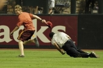 Event: A Diamondbacks fan has a very brief moment of fun evading security after running onto the field during a game against the Cubs. Moments later, he was tackled and hauled off to jail.