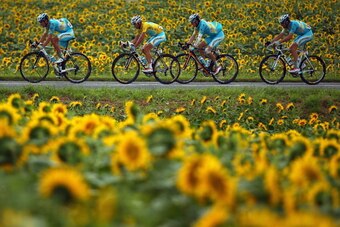 Event: Four cyclists are pictured during Stage 19 of the Tour de France.