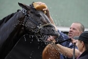 Event: A horse is groomed by trainers at Churchill Downs a few days ahead of the Kentucky Derby.