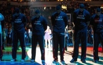 Event: Prior to a game between the Portland Trail Blazers and the Minnesota Timberwolves, players show their support for Eric Garner following a New York jury’s decision to not indict a police officer whose use of a chokehold caused Garner's death after he was accused of selling loose cigarettes.