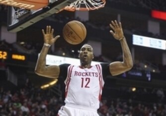 Event: Houston Rockets center Dwight Howard returns to earth after dunking hard on an Atlanta Hawks defender.